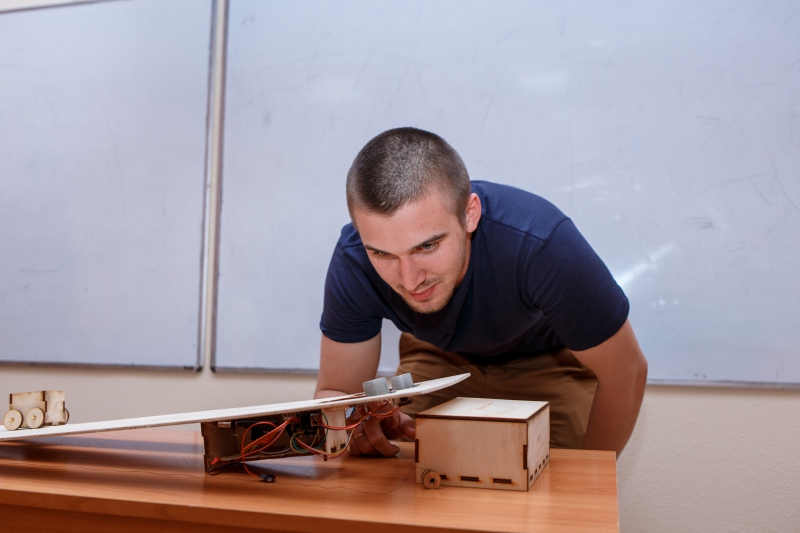 Third place went to the team that developed the Haulers project, a small-scale 1:72 prototype of a system designed to lift various hazardous cargo. The idea is that a special cart autonomously moves cargo from a lower to a higher point. For instance, when ore at a uranium mine needs to be moved up a mountain. The motorized cart moves up a slope, while a special robot awaits at the summit and offloads the cargo for further processing.