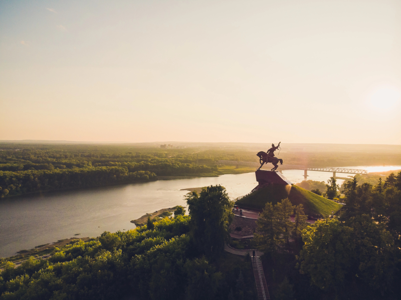 Though the city may seem large, most of the key sights are conveniently located in one area, so you could catch all of them in one long walk. First thing to see is the grand Monument to Salavat Yulaev, a national hero who participated in Pugachev's Rebellion during the reign of Catherine the Great. He was not only a warrior, but also a poet and writer. Actually, you can notice him from afar as soon as you enter the city – the monument is placed on a cliff overlooking the Belaya River.