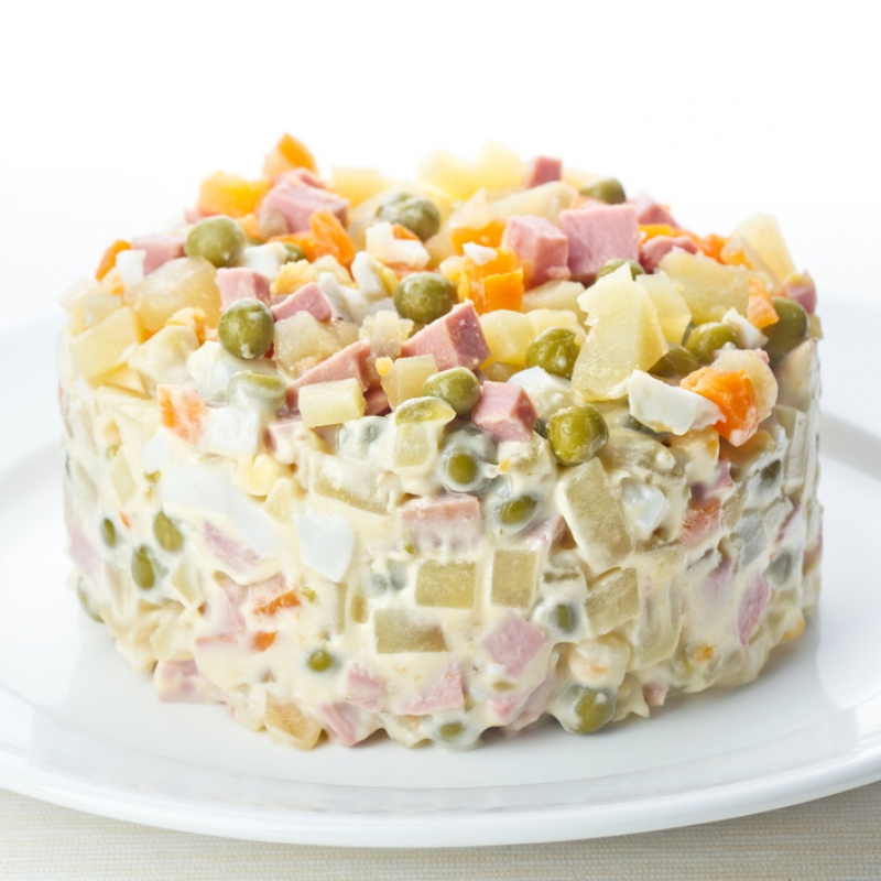 You can find this delicious salad in every cafe, restaurant or school cafeteria in Russia; but it’s also close to my heart because I grew up on Olivier salad in my little Persian household, completely unaware of the fact that it is a Russian (or French) dish. Whenever we had leftover roast chicken, it was “salad olivieh” time, and the only reason any Persian would have mayonnaise in their fridge would be for the specific purpose of making Olivier salad. In Russia, mayonnaise (or sour cream) is basically a staple for any salad or even soup. While the Olivier salad I knew and loved all my life was a lot more creamy, the Russian version is “chunkier”. All the ingredients - carrots, potatoes, eggs, pickles, and usually ham rather than chicken - are cut into identical cubes to match the size of the final ingredient: peas. The whole thing is decked out in mayonnaise and can simply be a meal in itself rather than a side because it’s so filling - but it’s almost always served as a side. Apparently the original salad was actually invented in the 19th Century in Moscow by a French or Belgian Chef, monsieur Olivier. Explains the name and the confusing origin.