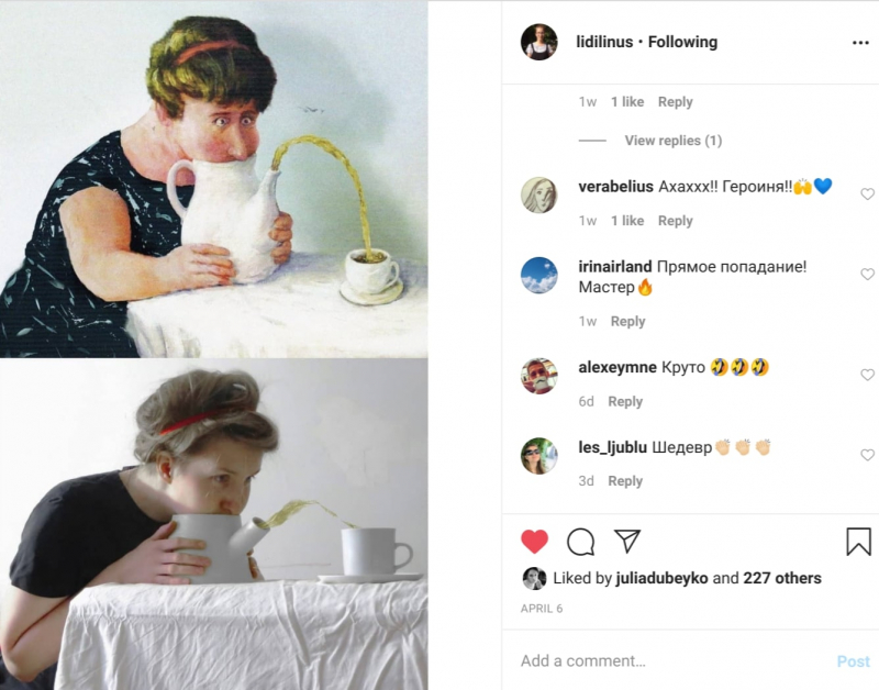 With more time on their hands, regular people, too, are finding ways to express their creativity and take it in a new direction. Cue the #изоизоляция (artisolation) challenge on Instagram, a Russian version of #betweenartandquarantine, and a Facebook group under the same name with over 460,000 users. The idea is to recreate famous paintings with whatever’s on hand – from curtains to toilet paper to dried fish. Some participants are shooting for close resemblance with the original works while others take a more creative approach. Some consider it a fun project that challenges their creativity and patience, while others see it as a social mission, hoping their work would make someone smile.