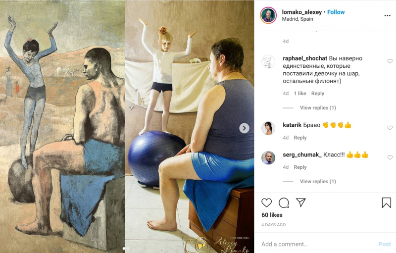 Art is as classical as it is contemporary. It has thrived on crises for centuries and now, once again, it is finding new forms and new ways to reach us. As everyone stays home, Russian artists are turning their own homes into a stage, giving us glimpses of their everyday life, bringing comfort and a sense of solidarity, and inspiring our own inner artists.