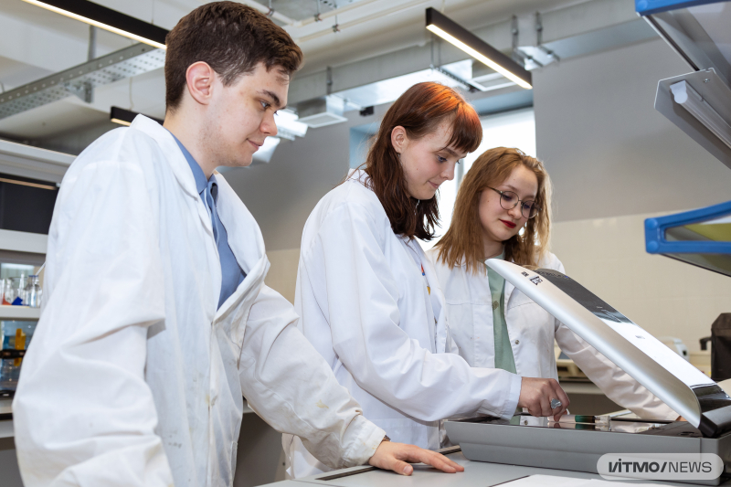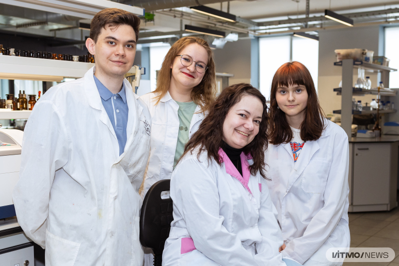 The research team: Leonid Gudzerov, Irina Vlasova, Daria Bulatkina, and the supervisor Svetlana Ulasevich. Photo by Dmitry Grigoryev / ITMO NEWS