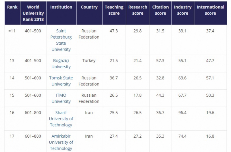 The Lomonosov Moscow State University topped the table, having the best region-wide scores in the International Outlook, as well as Teaching and Research Environment categories. Ranking second is the Industry Income high-achiever Moscow Institute of Physics and Technology, while the Tomsk Polytechnic University secured third position, rising to prominence in the Citation Impact category.