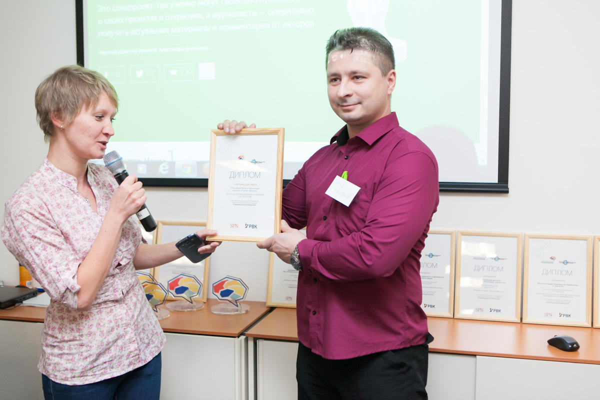 Итоговую встречу открыл Александр Потапов, исполнительный директор ОАО «РВК». Он рассказал о том, как появилась идея проекта и почему основной проблемой отношений между наукой, СМИ и PR стал даже не финансовый вопрос, а неумение находить общий язык. «Коммуникационная лаборатория» позволила участникам научиться лучше понимать друг друга. Была высказана идея о необходимости появления особой категории специалистов по связям с общественностью – научных PR-мэнов. То есть тех, кто должен непосредственно обеспечивать взаимодействие между университетами, НИИ и средствами массовой информации. Специально для этих людей ОАО «РВК» и SPN Communication подготовили пособие по научным коммуникациям «Формула научного PR», включающее советы и кейсы от 20 ведущих экспертов в сфере научной коммуникации.
