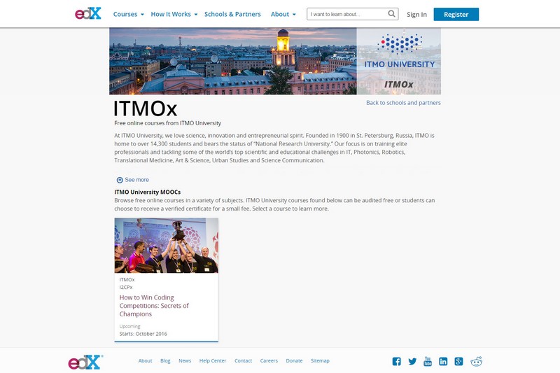 В преддверии финала международного чемпионата по спортивному программированию ACM ICPC, который в этом году проходит с 15 по 20 мая в Пхукете (Таиланд), Университет ИТМО анонсировал на edX первый курс под названием «Как побеждать в соревнованиях по программированию: секреты чемпионов». Занятия стартуют в октябре 2016 года и продлятся пять недель, а экзамен для студентов будет проходить в формате настоящего международного соревнования по программированию. За несколько дней с момента публикации информации о курсе на него записалось уже более 300 студентов.