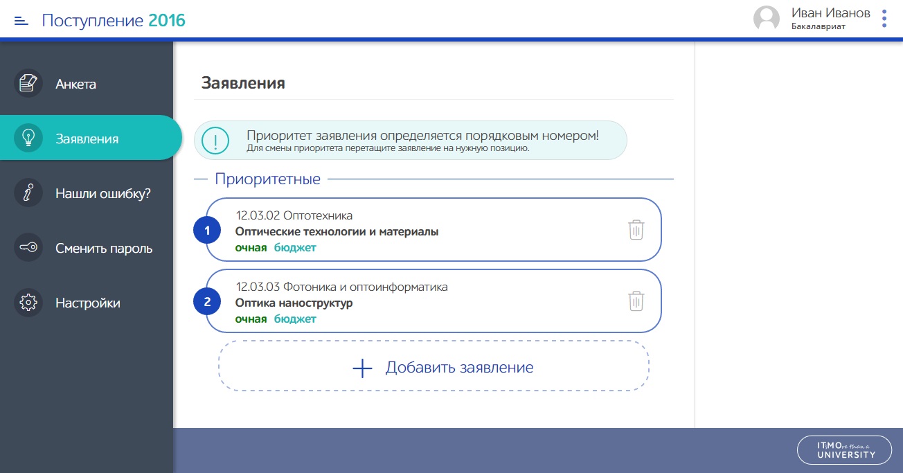 Если у заявлений на поступление теперь нельзя выставлять приоритет, почему в Личном кабинете на сайте для поступающих в Университет ИТМО оставлена такая возможность? Есть нумерация заявлений: 1, 2, 3.