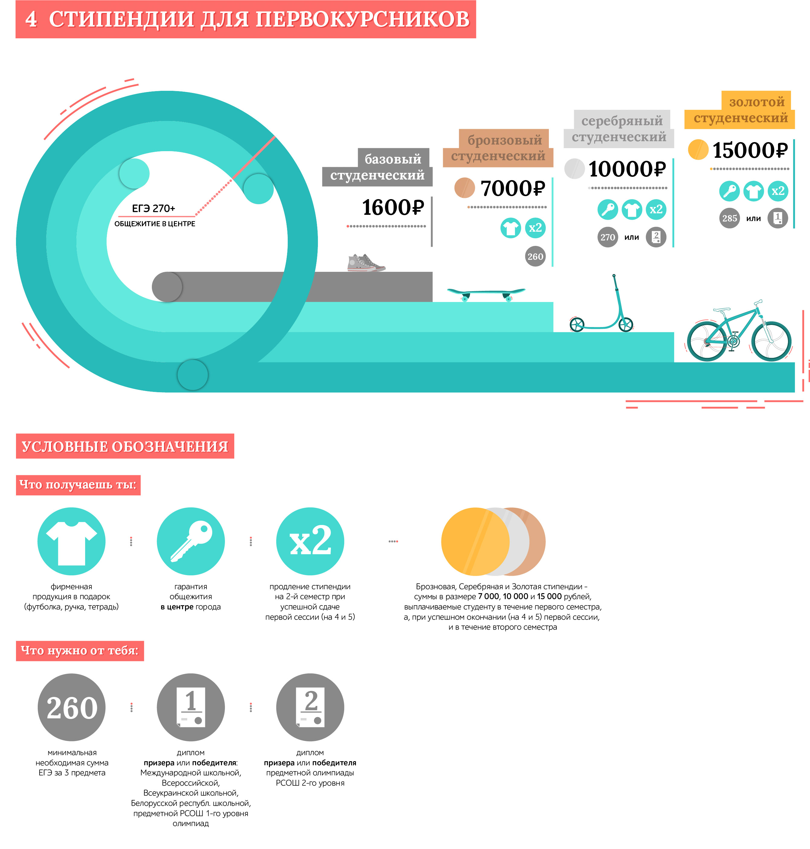 Главное нововведение заключается в том, что с 2016 года Университет ИТМО вводит для первокурсников три новых стипендии — Золотой, Серебряный и Бронзовый студенческие билеты, каждый из которых предусматривает свои бонусы. Если результат ЕГЭ по трем предметам у абитуриента составляет от 285 до 300 баллов или же он является победителем или призером одной из олимпиад высшего уровня — международной, всероссийской и так далее, то он получит «Золотой студенческий билет», который гарантирует место в общежитии в центре города и стипендию в 15 000 рублей в месяц.