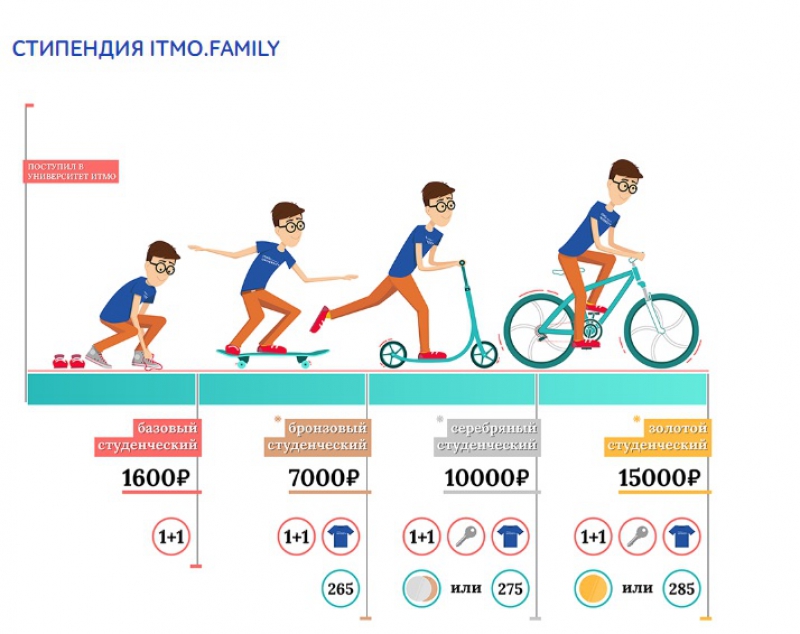 Также с 2016 года Университет ИТМО ввел для первокурсников три новых стипендии ITMO.FAMILY — Золотой, Серебряный и Бронзовый студенческие билеты, каждый из которых предусматривает свои бонусы.
