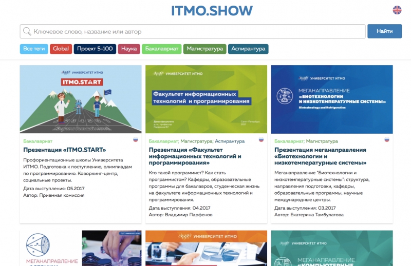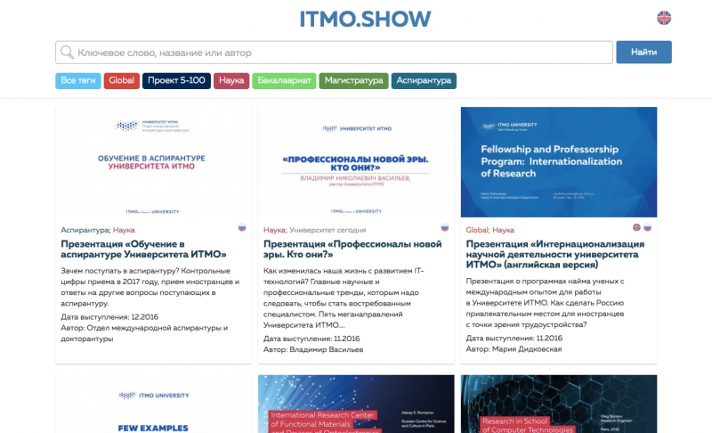 Под тэгом Global можно найти информацию, которая интересна максимально широкой аудитории, а в рубрике «Проект 5-100» хранятся ключевые для вуза презентации, отражающие цели, задачи и достижения Университета ИТМО в рамках одноименной программы. Найти презентацию можно либо по указанным тегам, либо через строку поискового запроса, в которую можно ввести ключевое слово, автора или точное название презентации.