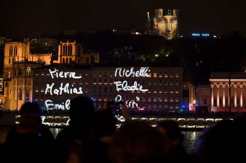 Двух зайцев поймать не удалось: фестиваль света в Лионе отменили из-за трагических событий в Париже 13 ноября. В город не приехало несколько миллионов туристов. Местные жители все же решили соблюсти давнюю традицию и одновременно продемонстрировать народное единство, озарив город свечами восьмого декабря в дань памяти о погибших. Свою солидарность показал и Даниэль Книппер, автор единственной оставшейся из 80 запланированных к фестивалю световых инсталляций. В тот же вечер французский светодизайнер спроектировал на одном из зданий образы людей и имена жертв теракта, назвав световую инсталляцию Regards (в переводе с англ. — «уважение»).