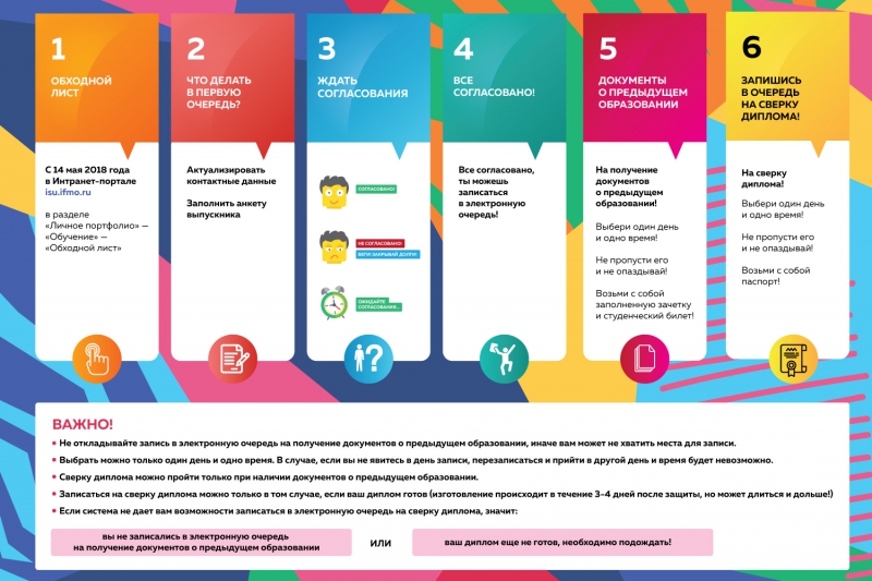 Согласно правилам, чтобы принять участие в торжественной церемонии вручения дипломов, которая состоится 7 июля 2018 года в Петропавловской крепости, выпускнику необходимо согласовать обходной лист, получить в отделе кадров документы о предыдущем образовании, а также провести сверку своего диплома в Департаменте образовательной деятельности.