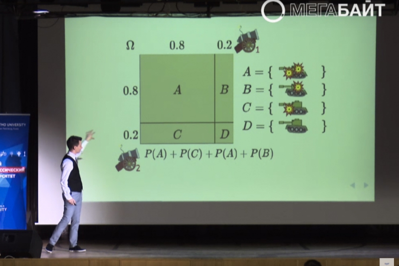 В чем он ошибся? Если изображать пространство вероятностных исходов в виде квадрата, то у нас будут четыре события: событие A — танк поражен дважды, событие B — танк поражен первой пушкой, но не второй, событие C — наоборот, и событие D — танк остался невредимым. Когда преподаватель складывал 0,8 и 0,8, он сложил вероятности AC и AB, то есть дважды учел событие, А — вероятность поражения танка двумя пушками одновременно. Из его результата нужно вычесть 0,8 во второй степени, и тогда мы получим правильный ответ — 0,96, или 96%. Эту же задачу гораздо проще решить другим образом. Нас интересует сумма вероятностей событий A, B и C. Это то же самое, что из единицы вычесть вероятность события D: 1 минус 0,2 во второй степени — тот же ответ, 0,96.