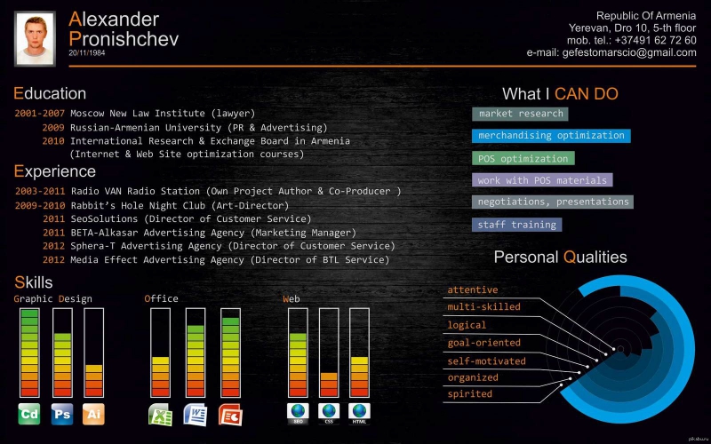 …никто не помешает создать вам резюме под конкретную компанию. В этом случае вы избегаете стандартных форм резюме с сайтов по поиску работы и проявляете себя. В последнее время появилось много шаблонов в виде инфографики, которые систематизируют данные о кандидате и делают картинку приятной глазу. Стоит помнить, что резюме не должно занимать больше одной страницы, так как рекрутеры уделяют одному резюме не больше 10 секунд. Нужно успеть запомниться им, и желательно не количеством страниц.