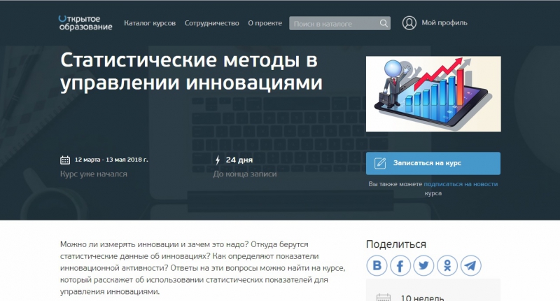Онлайн-курс стартовал на образовательной платформе «Открытое образование» 12 марта. Курс продлится 10 недель. Это первый русскоязычный курс, который расскажет об основах статистического учета инноваций, об основных формах статистического наблюдения за инновационной активностью организаций, о системе показателей статистики инноваций и интеллектуальной собственности. Основная идея создателей курса – научить слушателей анализировать и использовать при обосновании управленческих решений статистические показатели инновационной деятельности.