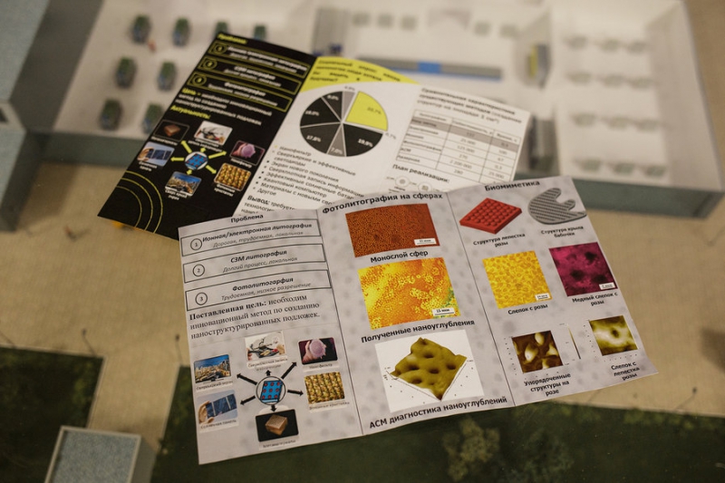 Этот проект школьники разрабатывали под руководством Михаила Жукова и его помощницы, студентки второго курса физико-технического факультета Полины Шабан. Сегодня массивы упорядоченных наноструктур постепенно начинают внедряться в производственный цикл при разработке современных приборов. В частности, с помощью подложек с такими структурами возможна разработка сверхъярких диодных панелей освещения, высокоэффективных солнечных батарей, экранов нового поколения, метаматериалов, накопителей данных с высокой плотностью записи информации, нанофильтров для очистки жидкостей и проведения медицинских анализов и других. В качестве основного метода создания упорядоченных подложек школьниками была выбрана оптическая фотолитография с использованием микро- и наносфер. Для этого на подложку наносится светочувствительный материал — фоторезист, а на поверхность резиста с помощью метода центрифугирования наносился слой из микросфер.