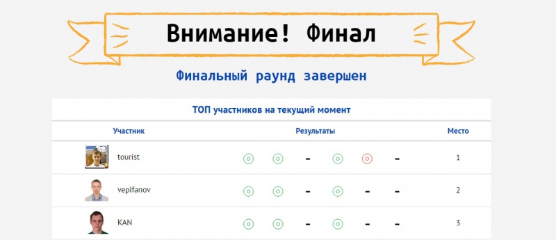 Геннадий Короткевич победил в чемпионате, решив три задачи из шести. С таким же результатом завершили контест обладатели второго и третьего мест — аспирант Нижегородского государственного университета Владислав Епифанов и студент НГУ Николай Калинин. Однако они набрали больше штрафных очков, чем победитель RCC. Штрафные баллы здесь начисляются по правилам ACM ICPC: за каждую решенную задачу приписывают штраф, который составляет время в минутах с начала соревнования до момента решения задачи. Кроме того, каждая неудачная попытка решить задание «награждается» 20 штрафными минутами.