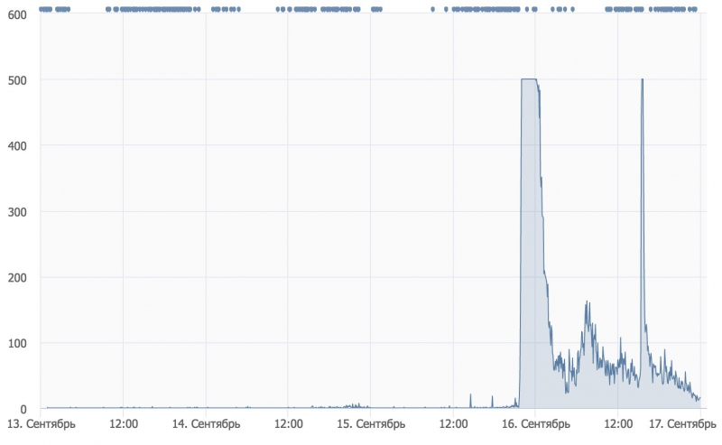 Мы также уделяем внимание статистике обращения в техподдержку. Наши пользователи, вообще, любят обращаться в техподдержку. В обычной ситуации мы получаем порядка шестидесяти обращений в пятиминутку в духе «Зачем вы меня заблокировали» или «Удалите мои голые фотографии со страницы такого-то человека». Однако, когда случается реальная проблема, количество обращений возрастает до 400 за пятиминутный период.