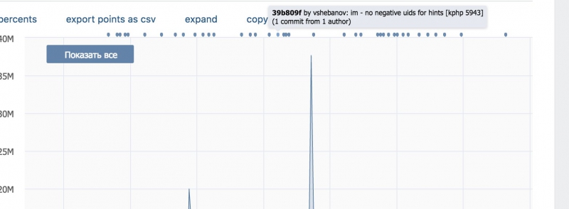 Исследуйте коммиты (сохранение изменений в программном коде — прим ред.) на графике. Собственно, если вы видите, что у вас на одном из графиков вылез «пик» и там пачка коммитов, то, скорее всего, они и привели к проблеме. Если там не сотни строчек кода, то вы довольно быстро найдете ошибку. Также у нас есть специальный чат, в который вбрасываются сообщения при каждом деплое вместе со списком коммитов, которые его сопровождают. Это довольно часто помогает.