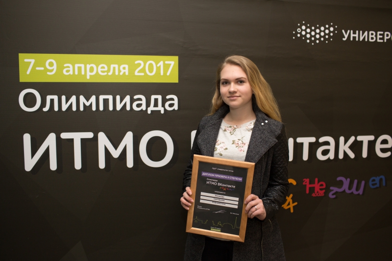 С компьютерными технологиями планирует связать свою дальнейшую жизнь и призер олимпиады «ИТМО Вконтакте» по информатике Элеонора Григорьева, которая специально приехала в Петербург из Рыбинска (Ярославская область). Как признается девушка, информатикой она интересуется с тех пор, как начала изучать этот предмет в школе. Пока Элеонора учится в 10 классе, но уже системно готовится к дальнейшему поступлению.