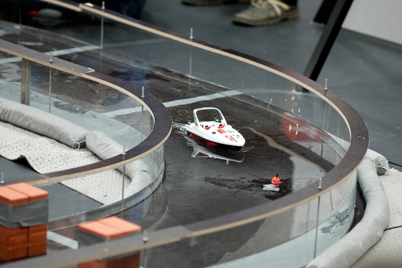 Водное ралли проходит в специальном бассейне-лабиринте. Особенность гонки в том, что разработчикам роботов никогда не известно заранее, какая именно трасса будет построена для соревнования: участники видят ее за несколько минут до старта. Это значит, что конструкторам необходимо заранее предусмотреть все возможные варианты развития событий. Например, в прошлом году организаторы Robotex сделали стенки бассейна прозрачными. В результате те роботы, у которых были световые, а не ультразвуковые датчики, оказались практически слепы при гонке, так как световые импульсы датчиков не отражались от прозрачных стенок, и устройство не могло сориентироваться в пространстве.