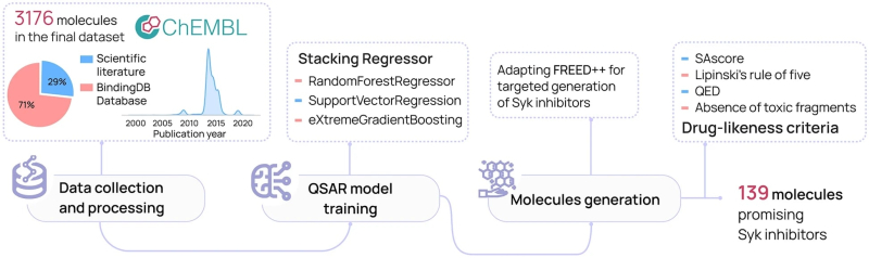 Однако не все известные соединения обладают высокой эффективностью и считаются безопасными: например, фостаматиниб — одобренный препарат для лечения иммунной тромбоцитопении — согласно некоторым исследованиям, вызывает побочные эффекты и не всегда дает стабильный результат. Поэтому ученые ищут новые подходящие ингибиторы Syk. Обычно это делают в лаборатории, отбирая и тестируя сотни или даже тысячи молекул вручную — такой традиционный поиск может занять годы и требует много ресурсов. Ускорить и упростить процесс поиска новых соединений можно с помощью ИИ.