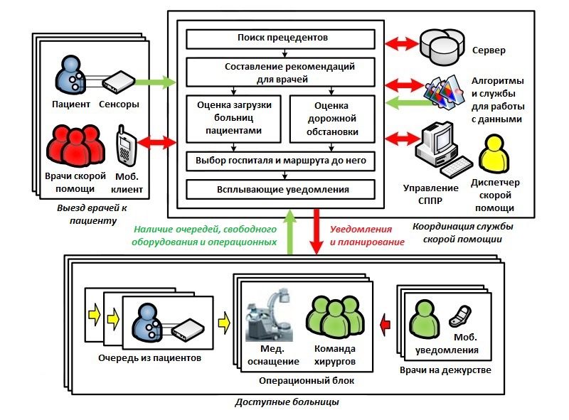 «Мы разрабатываем взаимосвязанную систему, объединяющую множество потоков данных и алгоритмов для их обработки в реальном времени, — рассказывает Сергей Ковальчук, первый автор статьи, старший научный сотрудник НИИ Наукоемких компьютерных технологий, доцент кафедры Высокопроизводительных вычислений Университета ИТМО. — На данном этапе мы определили архитектуру СППР и рассмотрели ее технические возможности. Мы изучили частоту вызовов скорой помощи, доставку пациентов в стационар и очереди, которые образуются, если два и более пациента направляются на операцию одновременно. Последний аспект очень важен, поскольку врачу придется выбирать, кого первым везти в операционную. Новая система позволит снизить вероятность таких пересечений».
