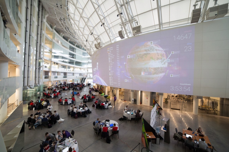 При этом на каждых соревнованиях, региональных или всероссийских, есть свой сюжет: иногда международные киберпреступники похищают данные национальных банков или чертежи отечественных звездолетов, а иногда действие разворачивается в будущем, где необходимо спасти от вымирания те или иные расы. Легенда RuCTF-2017 была связана с космосом: каждая команда получила виртуальный космический корабль-город. Инфраструктуру корабля как раз формировали сервисы, которых было семь: системы распределения еды, электроэнергии, поиска перспективных для развития участков планет, защиты от угроз, сервис, позволяющий городу решать технические проблемы силами внешних программистов, а также звездные врата для телепортации между городами. Седьмым сервисом был инкубатор с икрой инопланетян. Это был надувной бассейн с шариками из гидрогеля, в котором команды должны были покопаться, чтобы отыскать «флаг». «Флагом» был обыкновенный шарик с QR-кодом, который нужно было отсканировать.