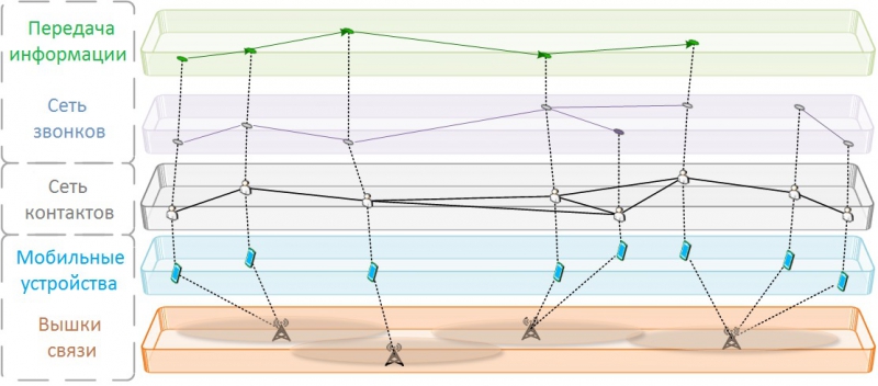 Компьютерная симуляция, созданная учеными, работает по принципу «сарафанного радио» и наглядно показывает, как мобильные абоненты передают друг другу информацию, совершая звонки. Модель включает в себя три уровня, или слоя, каждый из которых вносит свой вклад в распространение новости. Это сеть контактов, сеть звонков между абонентами и непосредственно пути распространения информации.
