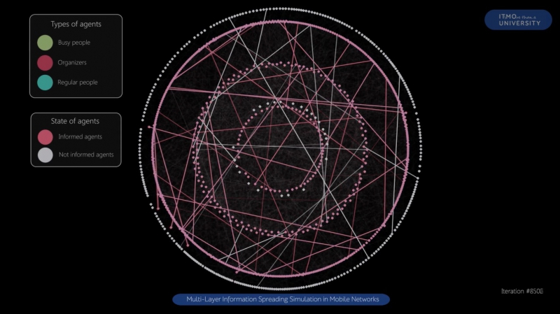 «В нашей модели, как и в реальности, абонент способен забыть новость после разговора, если она для него не важна или не актуальна. Цепь может оборваться и тогда, когда человек звонит дальнему знакомому, которого сообщение не интересует. Мы учли это и на основе многих параметров создали формулу, определяющую вероятность передачи информации между агентами», – говорит Александр Вишератин, инженер НИИ НКТ Университета ИТМО.