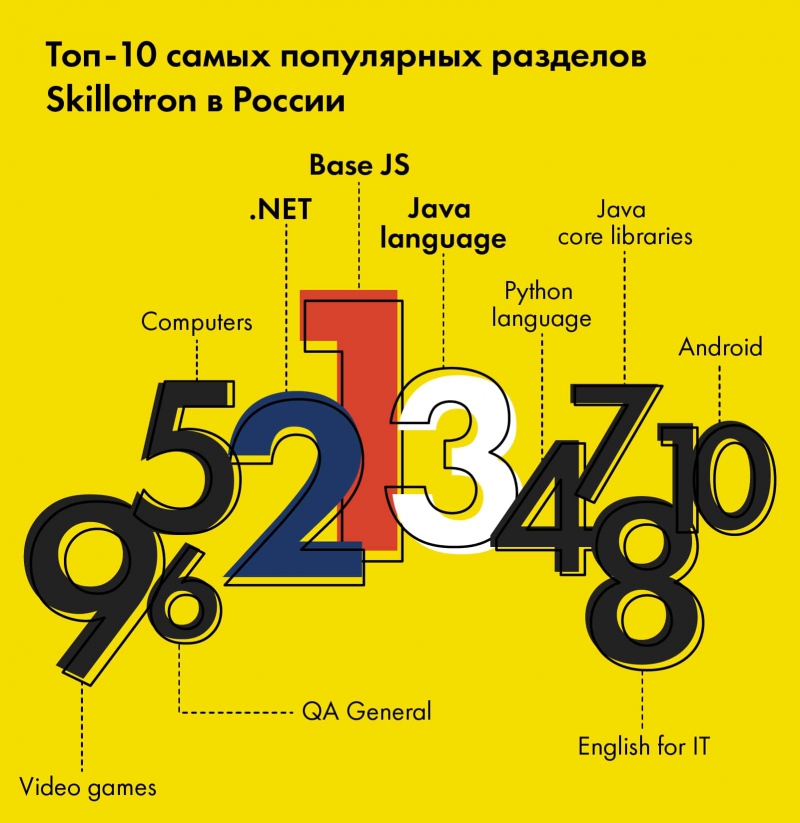 По некоторым параметрам показатели российских разработчиков сравнимы с остальными. Например, наиболее популярные разделы среди россиян посвящены JavaScript, .Net (C#), Java, QA и Python (в порядке убывания популярности), что в целом совпадает с ТОП-5 самых популярных разделов среди игроков по всему миру. Среднее количество разделов, которое проходит игрок из России, в среднем составляет шесть – эта цифра сопоставима с тем, сколько разделов проходят игроки остальных стран (5,5).