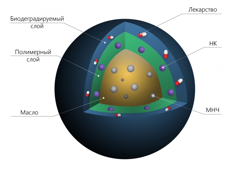 В Университете ИТМО адресную доставку лекарств собираются осуществлять с помощью гибридных магнитоуправляемых наносистем. Подобные системы обладают сложной структурой: магнитное ядро, полимерный слой с квантовыми точками, затем еще одна, биодеградируемая, оболочка, в которой размещены молекулы лекарственного вещества.
