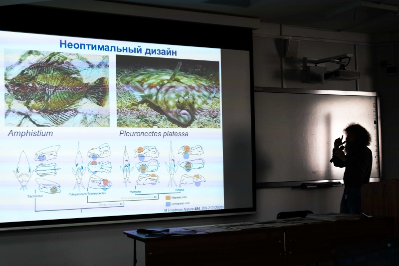 «Самый странный, на первый взгляд, неоптимальный “дизайн” у камбалы. Техзадание на создание этой рыбы понятно: давайте сделаем рыбу, которая будет жить на дне и чем-то там питаться. Отличник сделал рыбу в форме плоского “сканера” с ядовитым шипом, а двоечник придумал камбалу. Камбала была классическим инструментом “троллинга” эволюционистов со стороны креационистов. Предположим, чтобы была нормальная рыба, а потом один ее глаз переехал на другую сторону, потому что ей было неудобно смотреть, ведь рыба постоянно лежит на дне. Спрашивали: как же он мог так взять и стартовать, этот глаз? Где переходная форма? К счастью, нашлись правильные кости, на которых один глаз был немного смешен от нормального местоположения», – привел еще один пример лектор.