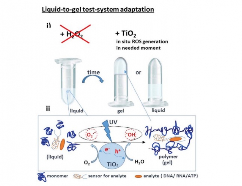 Новый метод основан на реакции полимеризации, при которой жидкое вещество акриламид в присутствии детектируемого вещества, то есть определенной РНК, превращается в гель. Полимеризация запускается под действием ультрафиолета свободными радикалами, источниками которых обычно служит пероксид водорода. Однако перекись небезопасна из-за склонности к детонации, разлагается на свету и хранится только при низких температурах, поэтому ученые заменили ее стабильным раствором диоксида титана. Это вещество тоже может служить источником свободных радикалов для полимеризации, но при этом хорошо переносит длительные перевозки и работает в условиях изменчивой температуры.