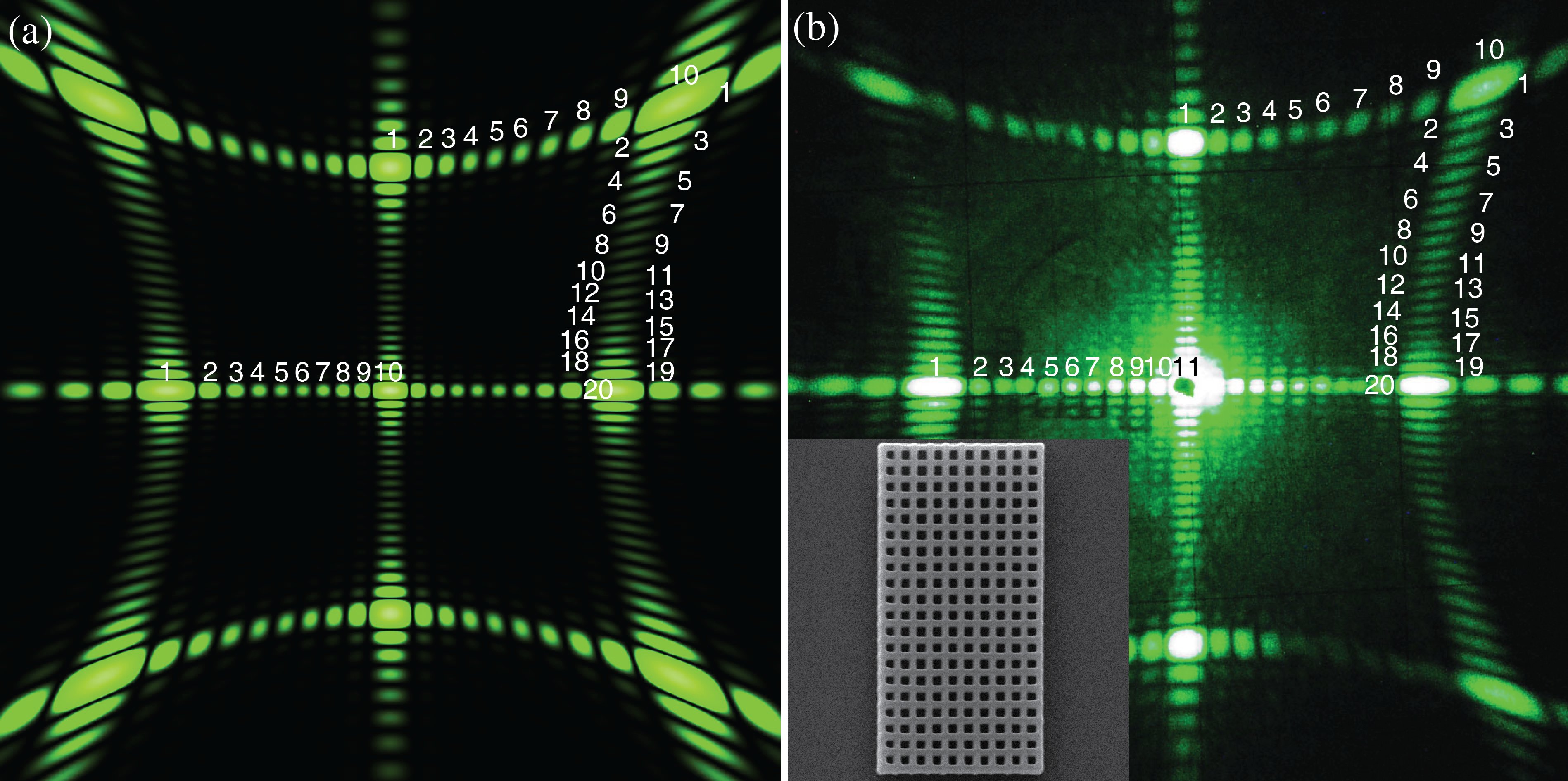 «Свет чувствует неоднородность, — рассказывает Михаил Рыбин, первый автор статьи, старший научный сотрудник кафедры нанофотоники и метаматериалов Университета ИТМО и лаборатории спектроскопии твердого тела ФТИ им. А. Ф. Иоффе. — В зависимости от взаимного расположения и формы рассеивателей волна распространяется за образцом определенным образом. Другими словами, структура и размер образца влияют на дифракционную картину, которую создаст свет, достигнув проекционного экрана. Мы обнаружили, что, глядя на эту картину, можно определить число рассеивателей в материале. Это позволяет узнать не только тип решетки образца (квадратная, треугольная), но и установить его строение (20 на 20 частиц или 30 на 15), просто посчитав пятнышки света на экране».