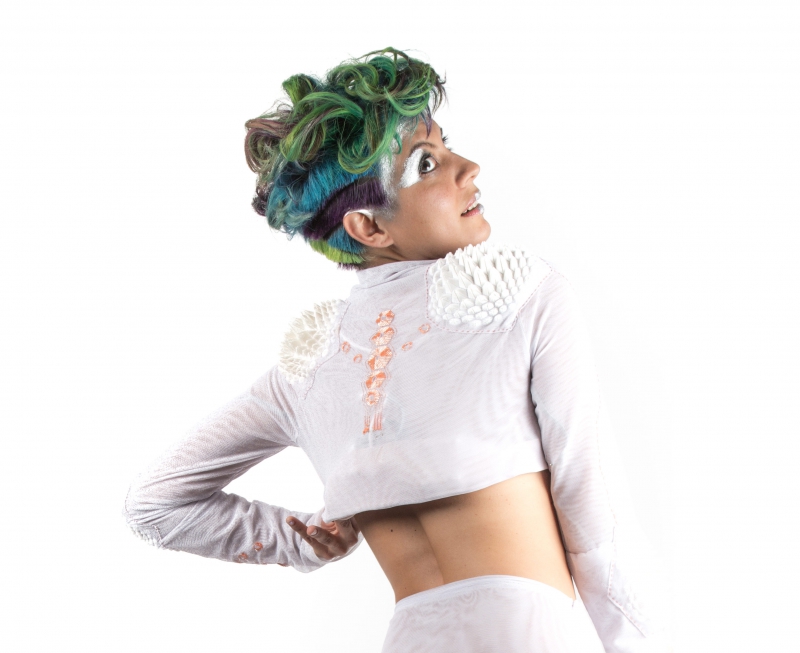 Порой наши чувства бывают не в согласии с нашим сердцем — оно не слушает нашу голову. Я придумала костюм, связывающий двух людей на расстоянии до трех метров: часть, надетая на одного, отражает частоту его сердечного ритма, другая — представляет собой головной убор для его партнера и транслирует сердечный ритм в виде звука. Частота ритма обозначается цветом, поэтому наш костюм дает возможность увидеть, как синхронизируется сердцебиение у разных людей, находящихся близко друг к другу.