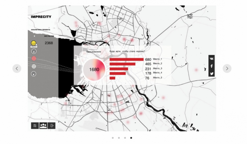 Также в рамках «Умного Санкт-Петербурга» ученые и исследователи Университета ИТМО разрабатывают интерактивную платформу IMPRECITY, которая также позволяет собрать и визуализировать эмоции горожан о городе и их неформальные практики в общественных пространствах, а также объединить горожан в сообщества, которые могут предложить проекты по развитию городских пространств при поддержке экспертов Университета ИТМО и администрации города.