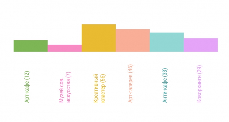 На сегодняшний день среди креативных пространств лидирует креативные кластеры (в выборке их 56), второе место по количеству занимают арт-галереи (46), затем антикафе (33), арт-кафе (13) и музеи современного искусства (7).