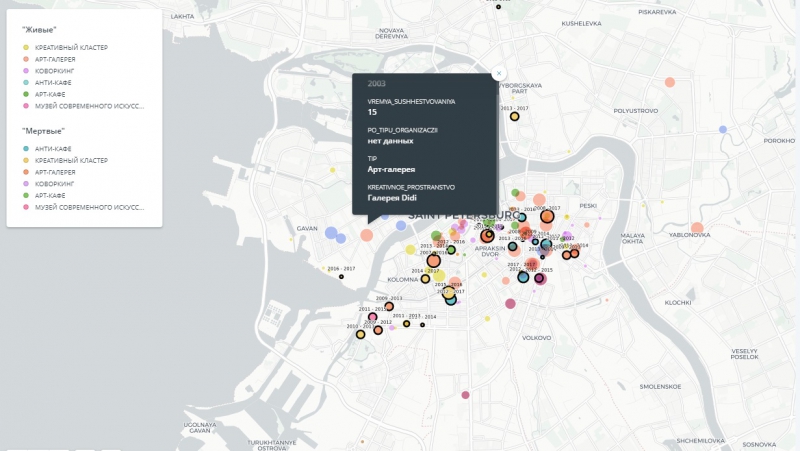 Географически креативное освоение Петербурга началось из центра города в начале 90-х, в конце 90-х перекинулось на Петроградку, с 2000-х постепенно распространяется на Васильевский остров, территории «серого пояса» и удаленные от центра районы. Известные арт-центр «Пушкинская 10» (1989 год) и арт-центр «Борей» (1991 год) стали первопроходцами в организации креатива Санкт-Петербурга. Через 10 лет последовало точечное появление новых экспериментаторов, поэтому только с 2000 года появление креативных пространств начинает набирать обороты. Статистика говорит о том, что с 2013 года по сегодняшний день, кроме 2016 года, ежегодно открывалось около 20 новых креативных кластеров, коворкингов и галерей.