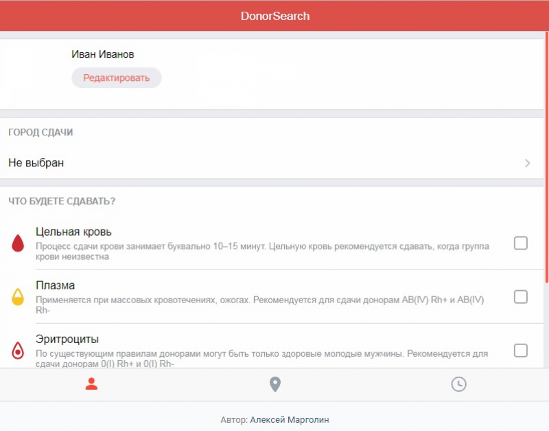 Денис Пешехонов: Приложение открывается в списке сервисов прямо внутри клиента ВКонтакте. Человеку не нужно ничего скачивать и регистрироваться, данные пользователя подтягиваются из его аккаунта. При входе в приложение пользователь видит три основные вкладки. На первой можно указать свою группу крови и резус-фактор, увидеть, что можно сдавать в соответствии с номером конкретной группы крови – цельную кровь, плазму, эритроциты, лейкоциты, тромбоциты или гранулоциты. До работы над проектом я даже не знал, что можно сдавать что-то кроме цельной крови. Также в этой вкладке можно корректно указать город – иногда в социальных сетях у людей указан город, где они родились, но проживают они в другом месте.