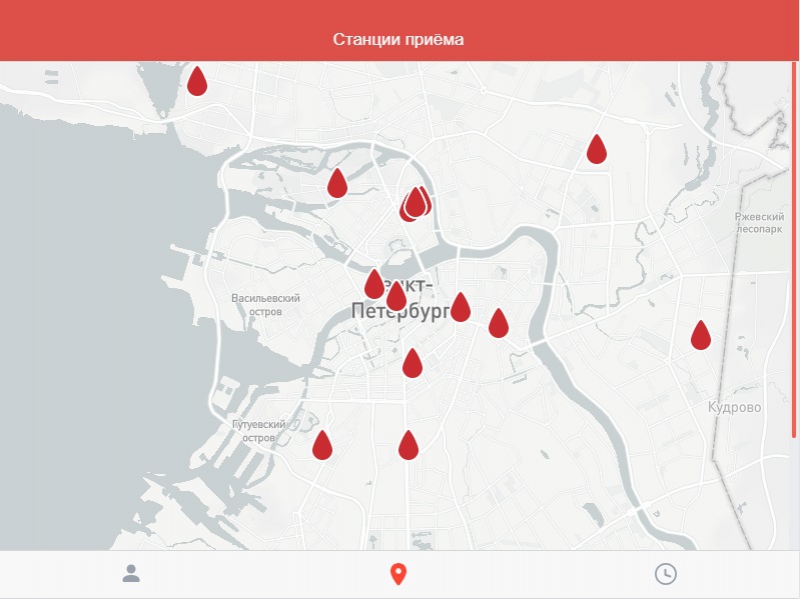 Григорий Французов: Вторая вкладка – карта. Здесь показаны все станции переливания в том месте, где находится пользователь. Приложение использует геолокацию человека и отображает станции, которые есть в базе DonorSearch для найденного приложением или указанного вручную города. Важно, что на карте пользователь видит отфильтрованные станции – только те, в которых принимают его группу крови и резус-фактор и где от нее не откажутся (бывает, у станции избыток крови). Также важно, что не на всех станциях принимают доноров-новичков и тех, у кого нет прописки в городе, это тоже учитывается системой. На карте некоторые станции подсвечиваются, это значит, что там дефицит крови вашей группы и резуса – на эти места нужно обращать внимание в первую очередь.