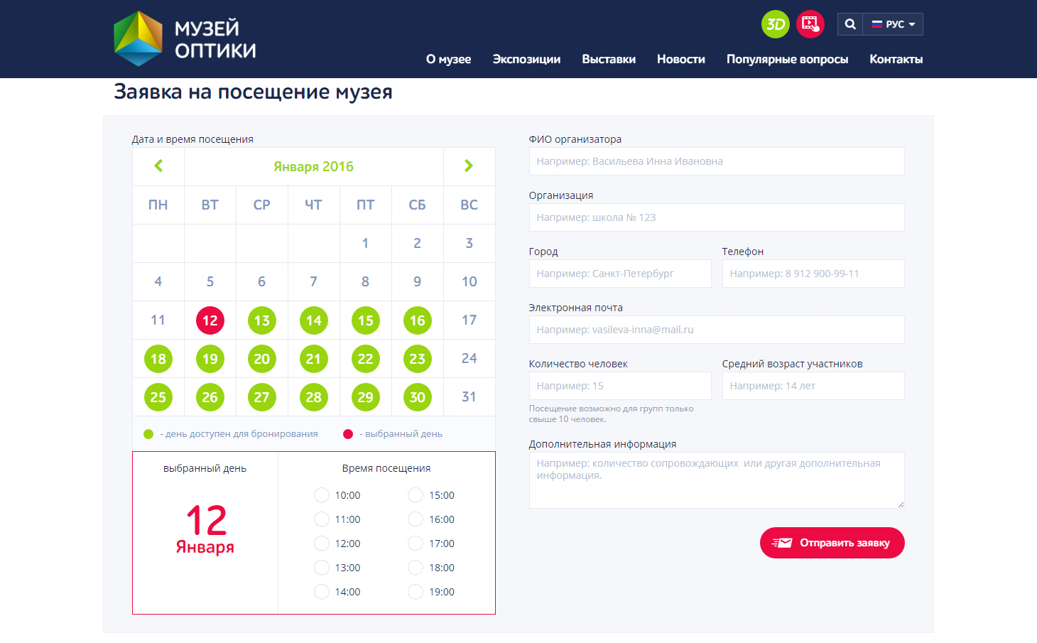 Обновленный дизайн сайта Музея оптики университетский департамент информационных технологий представил в конце декабря 2015 года. Главная особенность нового сайта — наглядное представление расписания работы музея. Из-за ограничений экспозиции музей может одновременно вместить только 30 посетителей, причем показ выставки ведется по предварительной записи. Прежний портал не предоставлял возможности увидеть, какие дни недоступны для посещения. Теперь же ознакомиться с графиком и забронировать нужный день посетители могут непосредственно на главной странице сайта Музея оптики.