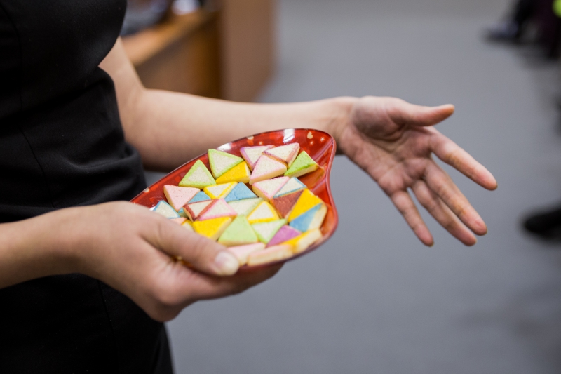 Александра Торопова презентовала проект, цель которого – разработка кондитерских изделий с применением оптических технологий. Выпускница Школы техноброкеров объединила хобби и специальность – создание кондитерских изделий и фотонику – и стала испытывать голографические технологии на карамели и желатине. С помощью них она получает красивые яркие изображения на сладостях без использования красителей, которые могут стать новым словом в декорировании кондитерских изделий. В изготовлении используется дифракционная решетка: с нее снимают силиконовую форму, заготавливают материал, после чего заливают в эту форму и получают дифракционную решетку на поверхности пищевого материала. В конце выступления Александра угостила всех пришедших леденцами и шоколадом с голограммами.