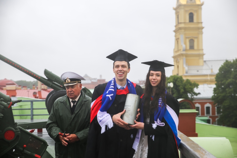 В первую субботу июля, как и год назад, старт городскому празднику дал полуденный выстрел из орудия Нарышкина бастиона, честь произвести который в этом году выпала выпускнице магистратуры Высшей школы светового дизайна Полине Литвиненко и выпускнику кафедры нанофотоники и метаматериалов физико-технического факультета Университета ИТМО Георгию Зографу.