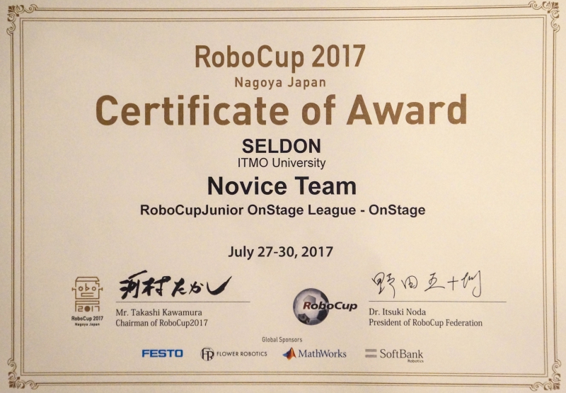 Второй командой, представившей Университет ИТМО стала школьная сборная вуза по робототехнике, которая в мае заняла первое место на всероссийском этапе соревнования RoboCup Russia Open-2017, прошедшем в Томске. Команда ребят под руководством тренеров, сотрудников кафедры систем управления и информатики Игоря Лосицкого и Евгения Заварина, сконструировала и запрограммировала робота по имени Seldon, который играет на укулеле, поет песни Адель и машет толпе фанатов. Робот покорил жюри в номинации для юношеских сборных RoboCup OnStage, где роботы должны стать частью сценической постановки.