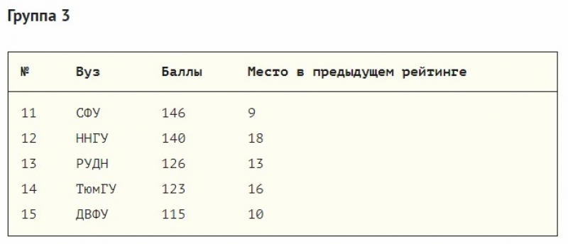 За каждый ответ на вопрос анкеты можно было получить от 0 до 12 баллов – максимум 195 баллов за все. В результате вузы-участники Проекта 5-100 были поделены на четыре группы: для получения «золотого» статуса нужно было набрать более 180 баллов, в «серебряную» группу вошли те вузы, что набрали от 150 до 180 баллов. «Бронзовые» университеты набрали от 90 до 150 баллов, а в четвертую группу по остаточному принципу входили все те вузы, что набрали менее 90 баллов.