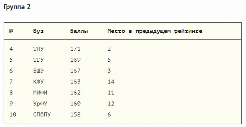 В «золотой» тройке рейтинга от «Индикатора» свое место сохранил только Университет ИТМО. Как и в прошлый раз, петербургский вуз достиг практически максимума возможных баллов (193), не добрав лишь несколько очков. В остальном расстановка сил в «золотой лиге» изменилась: второе и третье места заняли МФТИ (192) и МИСиС (187), которые ранее вошли в «серебряный» эшелон вузов, сместив Томский политехнический университет и НИУ ВШЭ с пьедестала почета.