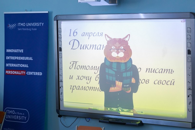 После пришло время «диктатора»: рыжий Кот Ученый с тщательно подобранным разработчиками интеллигентным голосом начал читать предложения по отдельности. По словам организаторов акции, голос Кота Ученого создан по уникальной технологии эмоционального синтеза, позволяющей естественно и правильно прочитать в режиме реального времени любой текст. Площадку для «Тотального диктанта» компания ЦРТ выбрала неслучайно: на базе центра в Университете ИТМО работает кафедра речевых информационных систем.