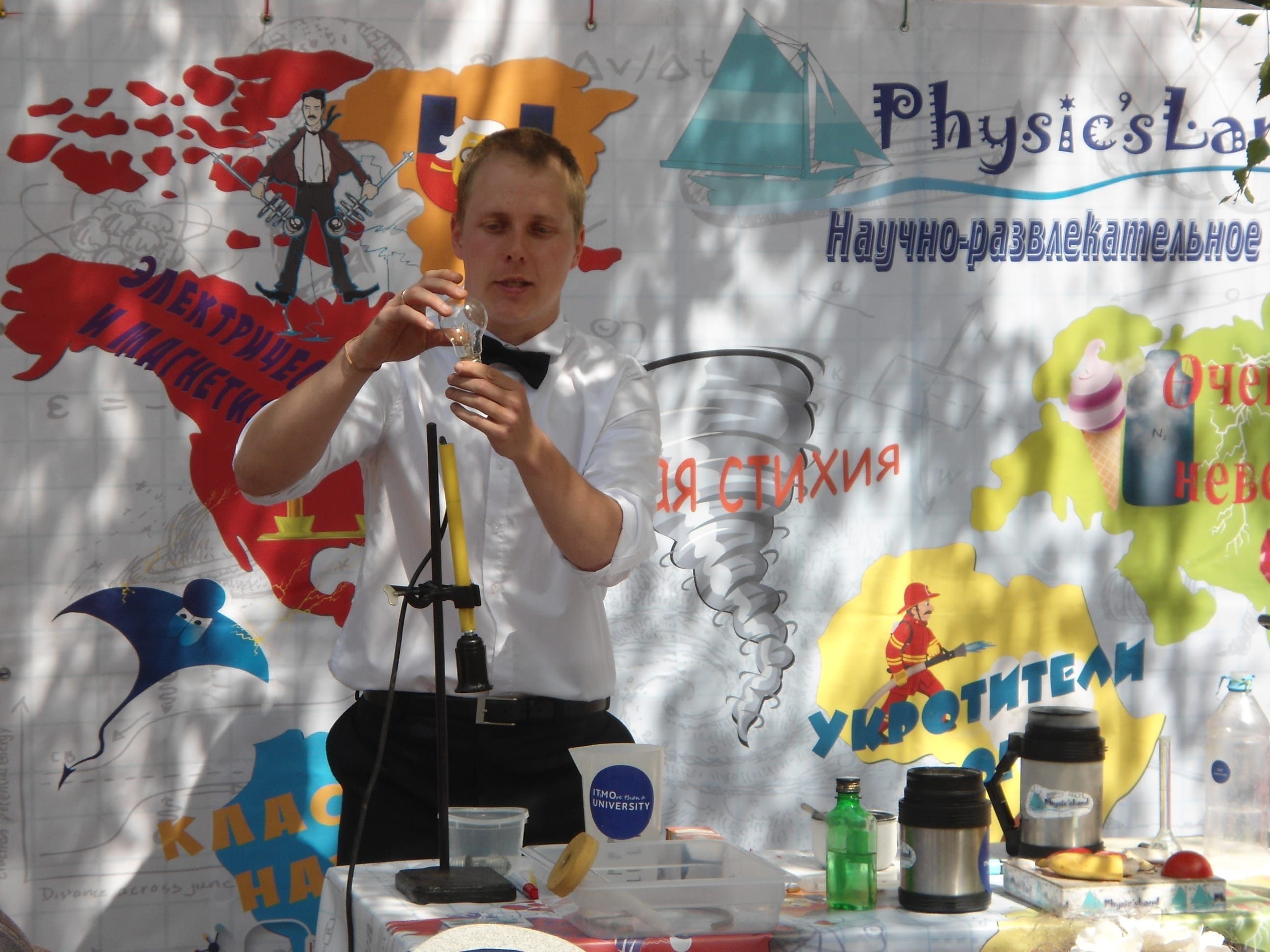 По словам заведующего кафедрой физики Университета ИТМО Игоря Баранова, участие в фестивале приняли молодые члены студенческого научного клуба Physics Land, созданного в сентябре прошлого года. Осенью, зимой и весной они посетили с научными шоу несколько школ, где сначала показывали физические и химические эксперименты старшеклассникам, а потом и ребятам помладше. Цель была простой — популяризация науки и привлечение умных и заинтересованных абитуриентов. Когда школьные «гастроли» закончились, клуб присоединился к фестивалю «Императорские сады России»: научные шоу собирали аншлаг даже в дождь и ненастье. За экспериментами с сухим льдом, жидким азотом и разнообразными кислотами с удовольствием наблюдали люди всех возрастов, а фирменное университетское мороженое приобрело новых почитателей.