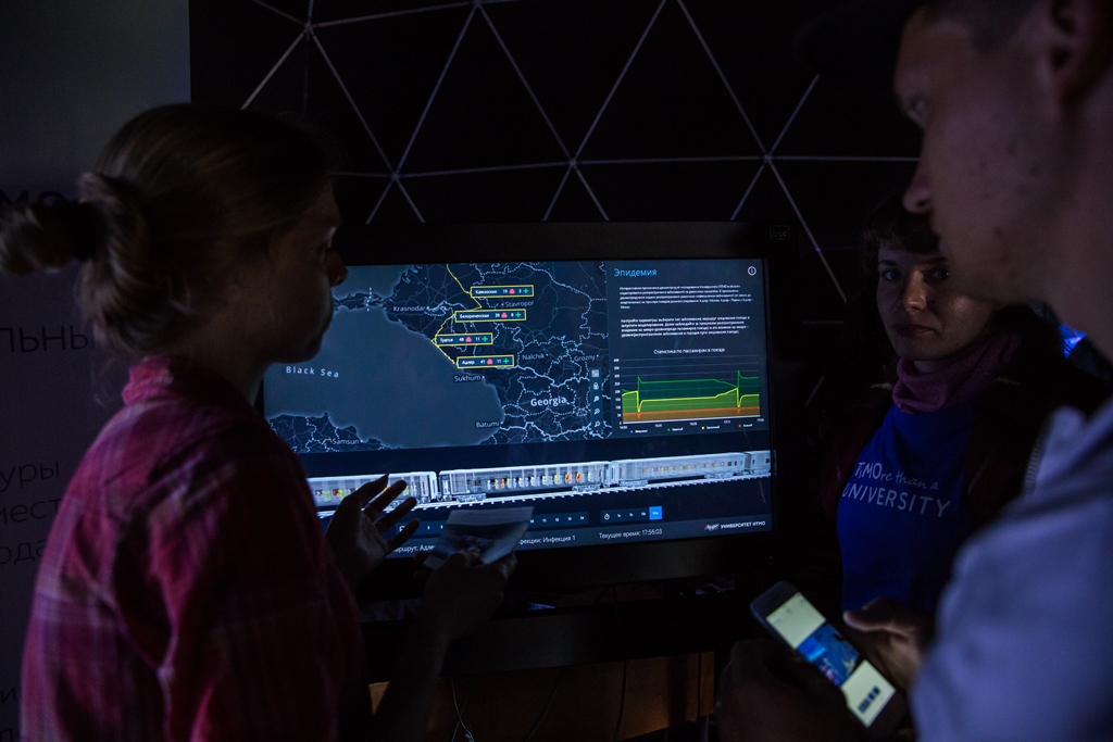 В шатре Lux Aeterna, где посетители городских мероприятий обычно могут посмотреть на инсталляции Высшей школы светового дизайна, в этот раз свои разработки также представили кафедра высокопроизводительных вычислений и НИИ наукоемких компьютерных технологий Университета ИТМО. Одна из них — атлас человеческого тела, в котором можно выборочно включать «слои» с разными системами органов и наблюдать, что будет происходить с организмом, если в каком-либо из участков кровеносной системы появится тромб. На другом стенде транслируются публикации участников VK Fest, собираемые в Instagram по хештегам и геометкам в режиме онлайн. Третий же экран демонстрирует работу трехуровневой интерактивной модели, с помощью которой можно проследить за распространением заболевания в условиях поезда и увидеть, какое это может иметь влияние в популяционных масштабах. Особенность разработки в том, что болезнь развивается в процессе наблюдения: количество здоровых, заболевших и выработавших иммунитет пассажиров меняется в зависимости от выбранных параметров — сколько носителей болезни село на станции отправления и по какому маршруту следует поезд.