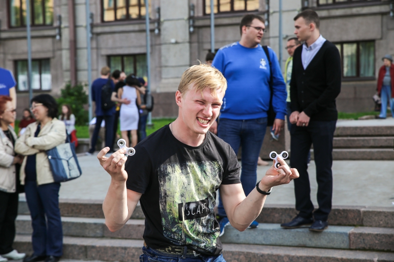Впрочем, без подарка не ушел ни один первокурсник. В стартовом наборе мегастудента, который выдавался каждому пришедшему перваку, можно было найти все необходимое для первых дней учебы: экслюзивную тетрадь для конспектов, визитку со ссылкой на гид по Университету ИТМО, пиксельное сердечко-значок, который многие сразу же прикрепили на одежду, и даже брендированный фиджет-спиннер!